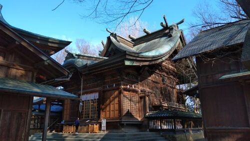 今回も長野県千曲市の武水別神社について。 前編では高良社などの境内社について述べました。 当記事では拝殿と本殿について述べます。 拝殿 勅使殿の後方には拝殿があります。 神楽殿のような外観をしていますが、立札に「拝殿」と書かれています。 梁間3間…