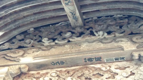 大虹梁の上には力神が座り、左右に雲の彫刻が添えられています。