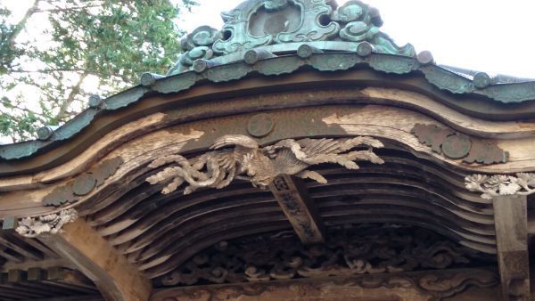 その上の虹梁には大瓶束が立てられ、左右には怪鳥の彫刻が収まっています。