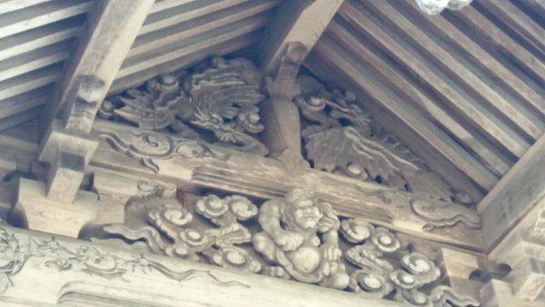 虹梁の上には台輪が通り、中備えは詰組と彫刻が入っています。詰組は、木鼻のついた出三斗で、通し肘木が使われています。彫刻は、鳳凰。
