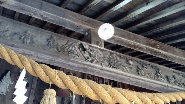虹梁には、なんらかの神事の様子を描いたと思われる彫刻。
