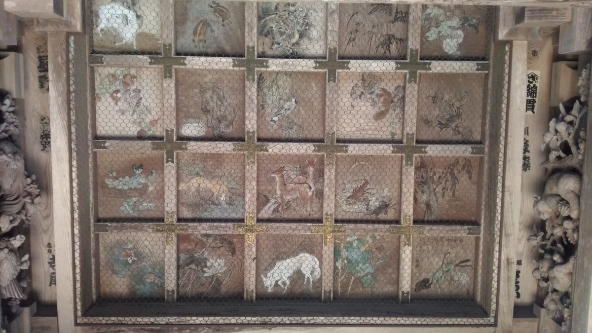 通路部分は格天井で、鳥獣を題材とした天井画があります。