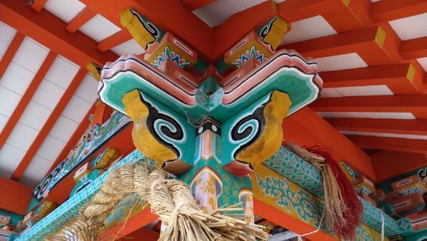 柱間にわたされた虹梁には、極彩色で竜が描かれています。