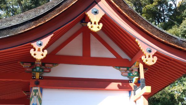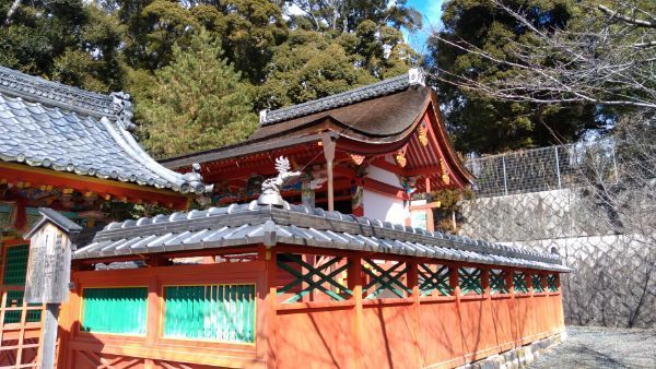 境内は、飛鳥時代~奈良時代の遺跡が点在する一帯にあり、参道はJR奈良線の踏切によって分断されています。室町中期に造られた本殿は、華やかな朱塗りの彩色で、国重文に指定されています。
