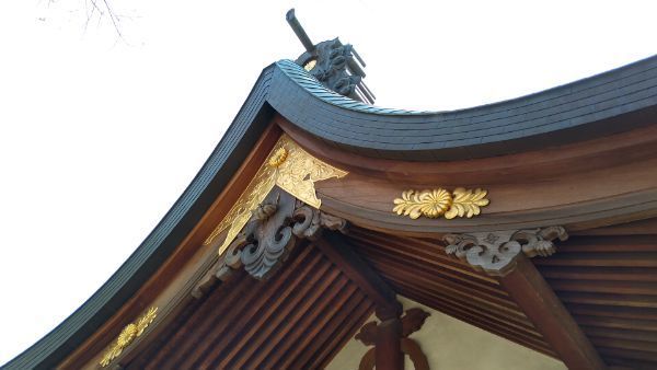 破風板の飾り金具には菊の紋の意匠。大棟や鬼板にも菊の紋があります。