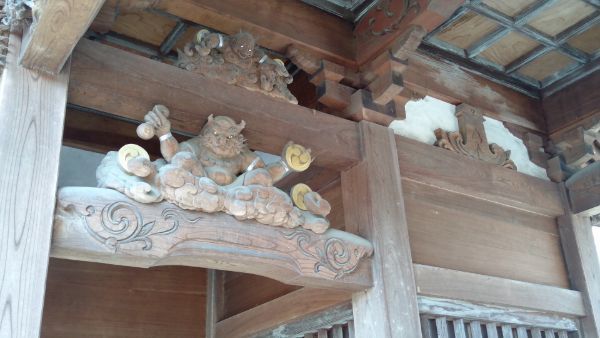 虹梁の両端には、波と竜(あるいは怪鳥)が立体的に彫られています。その左右には唐獅子の木鼻。