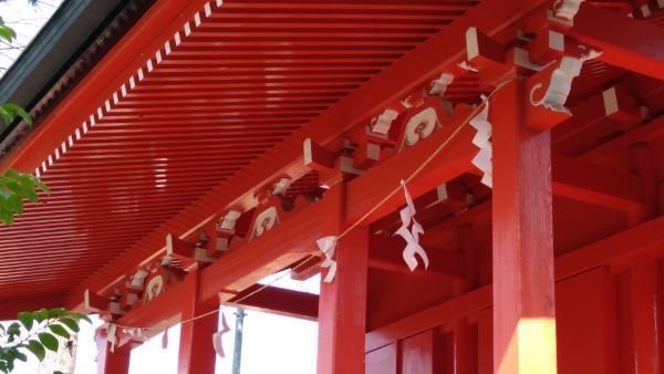 拝殿の後方には、屋根付きの玉垣に囲われた本殿が鎮座しています。こちらも朱塗り。