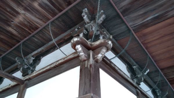 組物は木鼻のついた出組。金網で見づらいですが、組物に実肘木がなく、通し肘木となっています。
