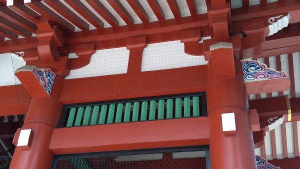 飛貫と頭貫のあいだには緑色の連子。頭貫の上の中備えは間斗束。