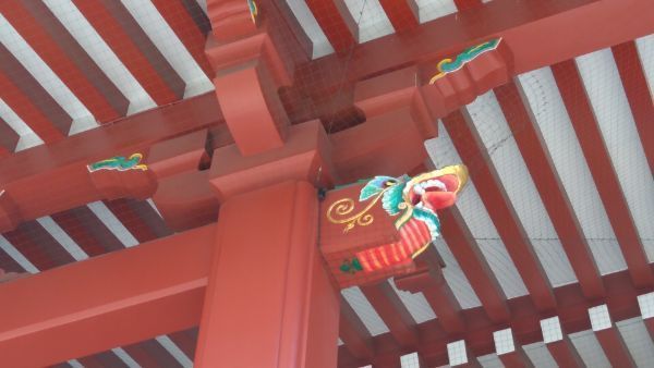 柱は円柱で、頭貫には木鼻。木鼻は渦状の彫刻が入り彩色されていますが、シルエットは大仏様木鼻に似ています。