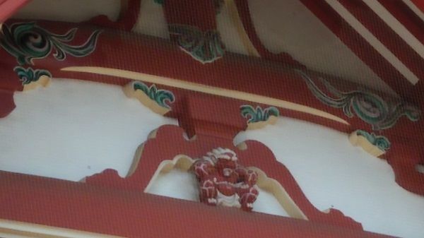 虹梁の上の蟇股は、赤色の花が彫られています。