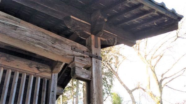 外部からは観察できませんが、案内板*2によると、隅木は室内と室外を境に「く」の字型に曲がっているとのこと。これは屋根の形状と柱の位置を調整するための工夫で、ほかの建築では見られない技法らしいです。