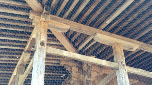 隅の部分では軒桁が交差し、交差した場所で軒裏の隅木を受けています。