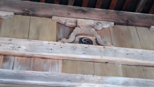 正面中央の桟唐戸の上の中備え。蟇股が置かれています。蟇股のはらわたには、三つ巴のような渦状の彫刻。