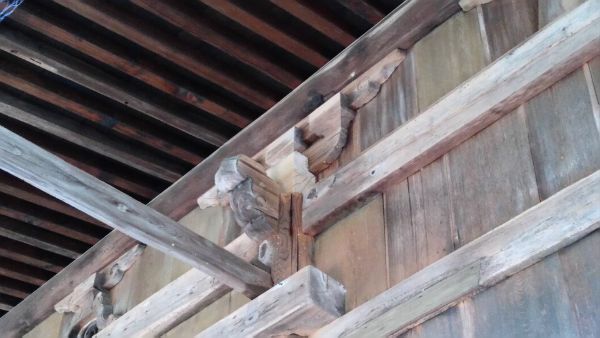 柱の内側(写真左)には挿肘木の斗栱が出て、虹梁を持ち送りしています。