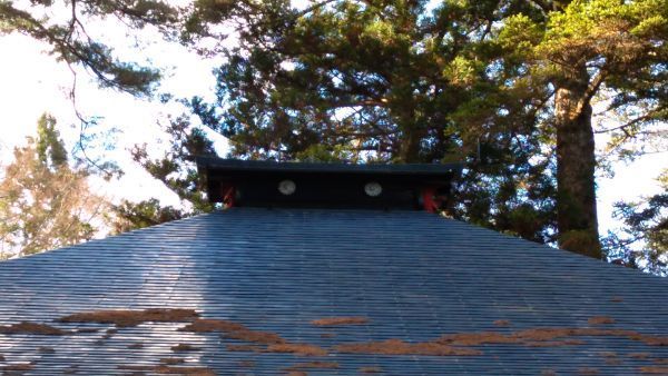 大棟の小さい屋根の下に、赤い鬼面が見えます。大棟の鬼面は甲信地方の寺社でしばしば見かける意匠です。