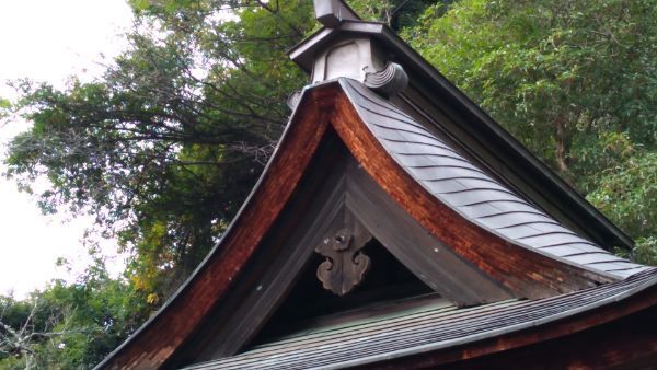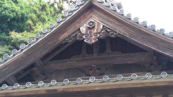 妻飾りは笈形付き大瓶束。破風板の拝みには鰭付きの懸魚。
