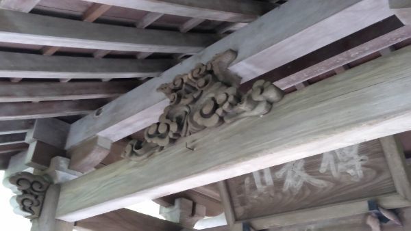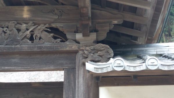 正面の間口の上には菱形の欄間がつき、その中央に蟇股が配されています。蟇股の彫刻は、犬と思しき獣。