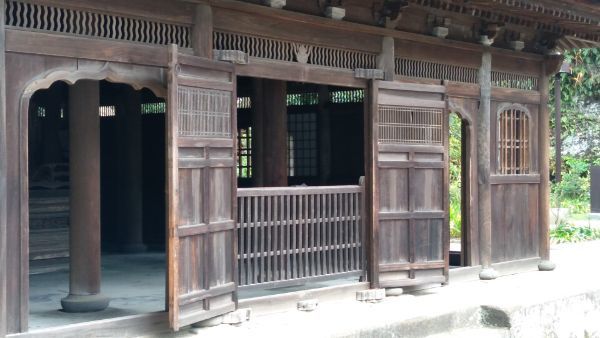 左端の柱間は、火灯窓と縦板壁。火灯窓には吹き寄せ格子が張られています。