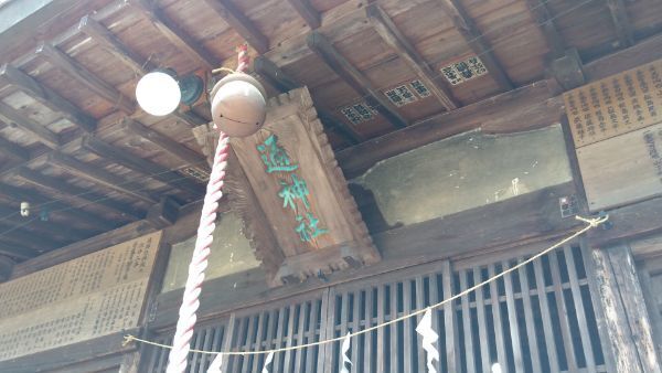 正面中央の軒下。扁額は「通神社」。扁額の裏には蟇股があります。