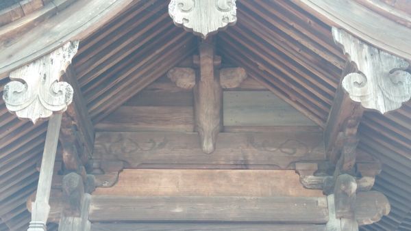 妻虹梁には、若葉状の絵様が線彫りされています。