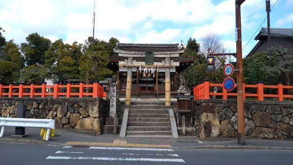 福王子神社の境内は南向き。仁和寺の二王門から道沿いに300メートルほど西にある、福王子という交差点に面しています。