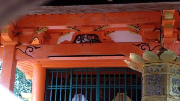 虹梁は眉欠きと袖切が彫られ、渦状の絵様がついています。