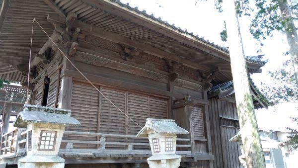 梁間5間・桁行13間?、二重、入母屋(妻入)、正面向拝3間 軒唐破風付、左右両側面向拝1間、桟瓦葺。