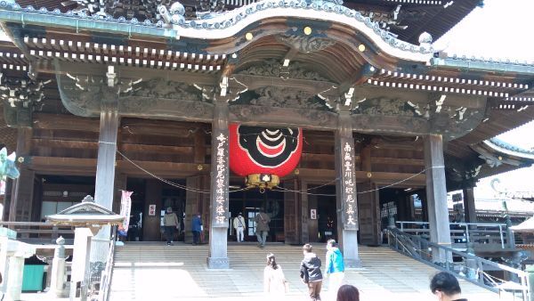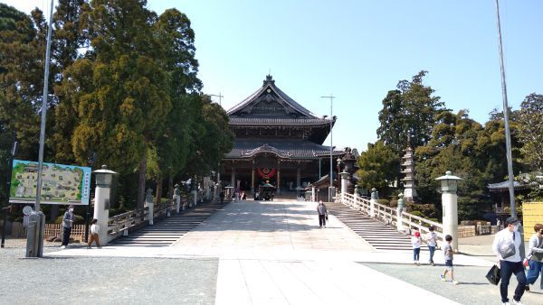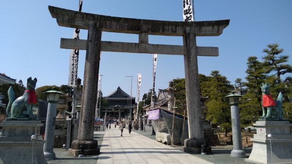 善光寺本堂(長野市)によく似ている、と思ったのですが、善光寺は撞木造という特殊な造りであるのに対し、豊川稲荷は通常の入母屋(妻入)で、背面の構造が大きく異なります。また、善光寺は母屋の周囲1間通りに裳階(もこし)という庇が付いて二重に見えるのに対し、豊川稲荷は二重屋根です。両寺はこれといった関連もないうえ宗派も異なるため、ただの他人の空似でしょう。