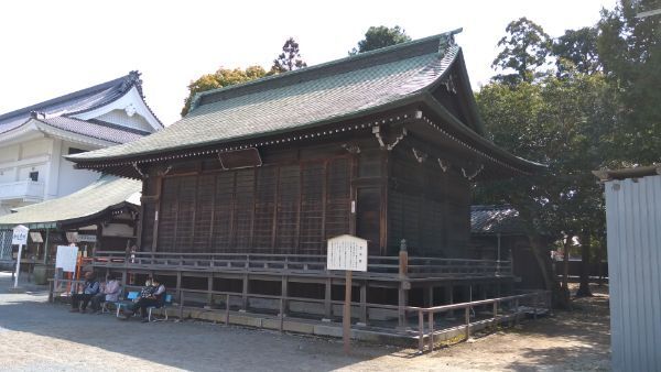 案内版によると1824年造営。当初は本殿の祈祷殿として造られたもので、大本殿(おそらく現在の本殿のこと)の再建にともない移築されたとのこと。内部には絵入りの格天井が張られているようです。