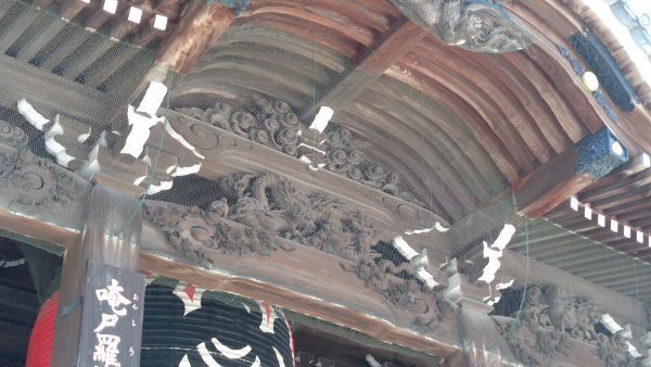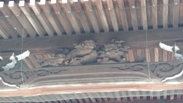 虹梁には、若葉の絵様が立体的に彫られています。中備えは竜の彫刻。