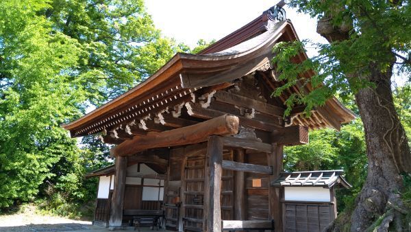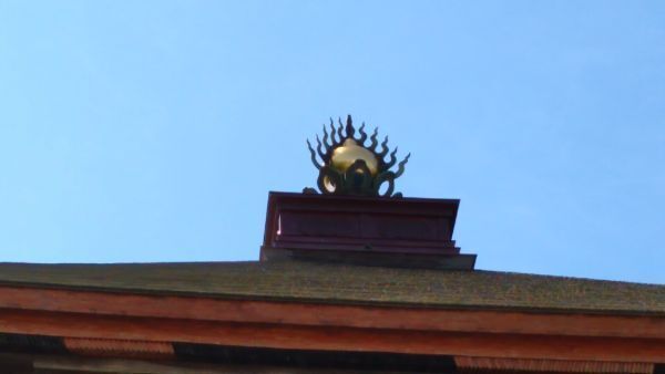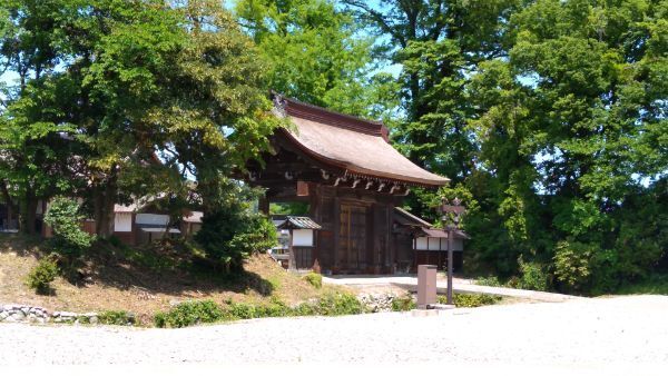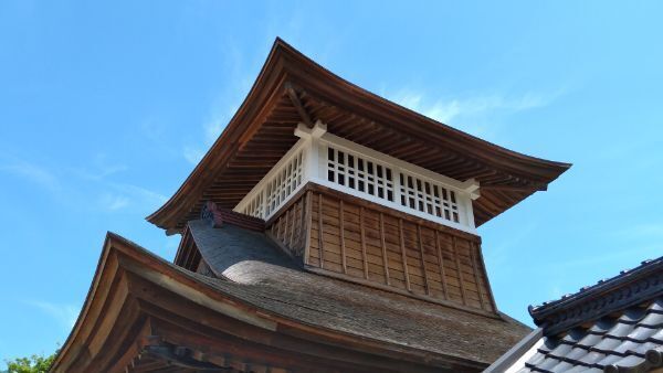 案内板によると、造営当初は現在の宝蔵の西あたりにあったようで、1859年(安政六年)に現在地へ移築されたとのこと。移築時に瓦葺に改められましたが、平成期の修理で当初のこけら葺に復されました。