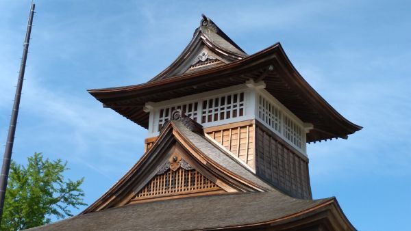 土蔵造、二階建、入母屋(妻入)、こけら葺。