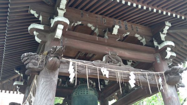 拝殿向かって右手前、境内南側には鐘楼があり、内部に梵鐘が吊るされています。おそらく神仏習合の時代のなごりでしょう。