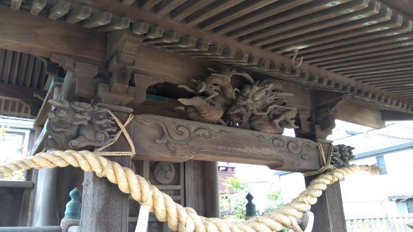 向拝には、唐獅子や竜の彫刻が配されています。