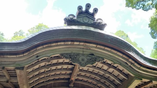 正面の虹梁中備えは蟇股。中央には菊の紋が彫られています。