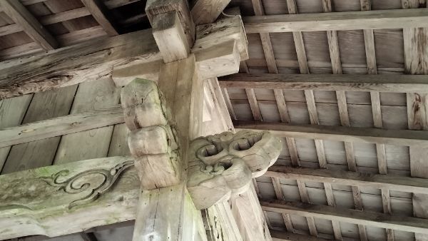 角度がついていてほとんど見えないですが、虹梁中備えは蟇股で、はらわたに鳥と思しき彫刻が入っています。