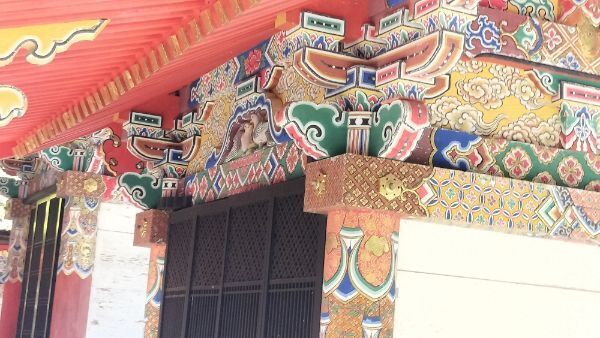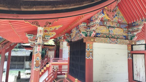 紅白を中心とした彩色で、桁や組物などの部材は桃山風の極彩色で塗り分けられ、きらびやかな作風です。