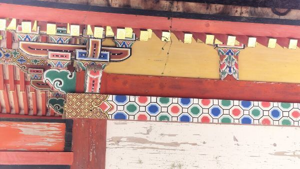 虹梁は中央部に唐草と牡丹が描かれています。中備えは蟇股で、虎の彫刻が入っています。