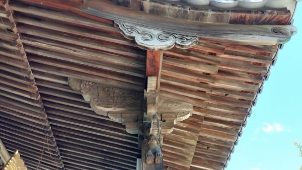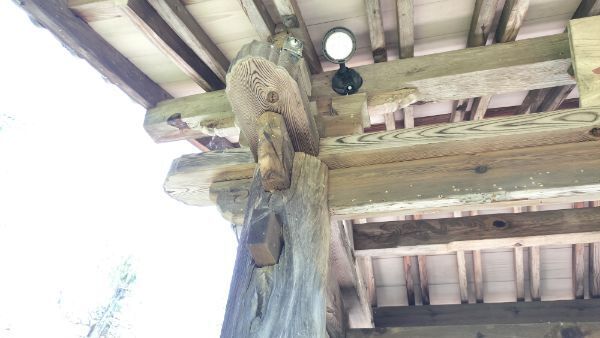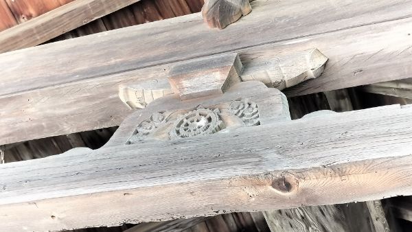 向拝柱の上では、板状の手挟が軒裏を受けています。手挟には菊らしき植物の彫刻がありますが、題材がよく解りません。