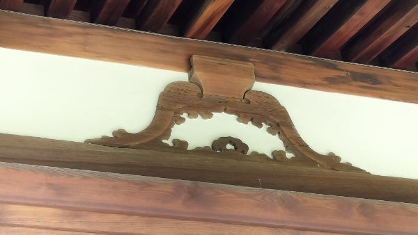 妻飾りは二重虹梁で、中央に波の彫刻が置かれています。懸魚の影になってしまっていますが、二重虹梁の上には蟇股があります。