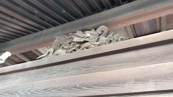 妻飾りは二重虹梁で、大瓶束や蟇股が使われています。妻壁中央の蟇股には、鳳凰の彫刻。