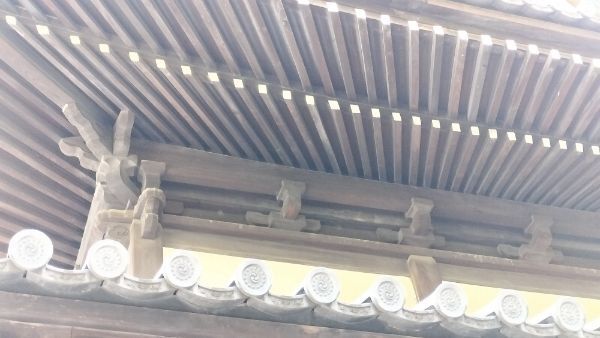 上層の軒裏は、放射状(扇垂木)の二軒繁垂木。下層を平行垂木、上層を扇垂木とするのは、禅宗様建築でよく見られる技法です。