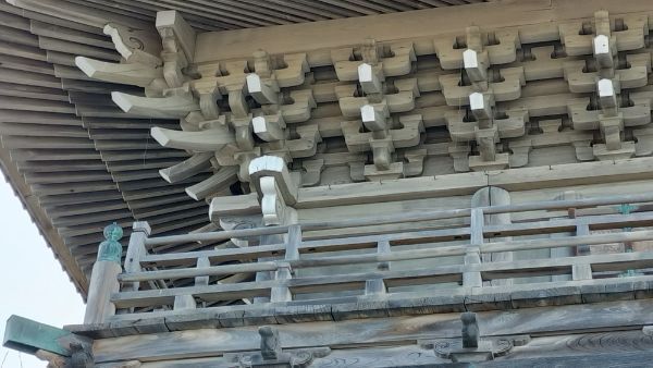柱上の組物は二手先。真下に柱のない位置にも組物が置かれています(詰組)。