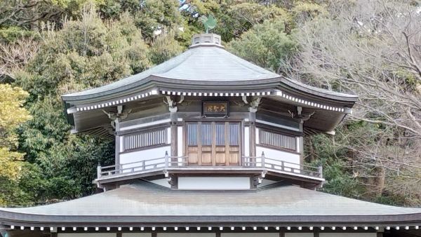 開山堂と本堂のあいだの渡り廊下からは、庭園と大聖閣を見ることができます。