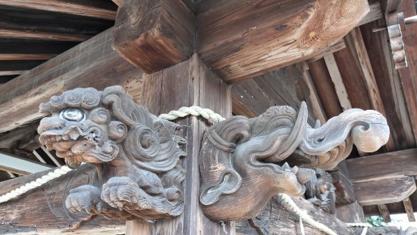 虹梁の上には、2体の鯱の向かい合った彫刻が置かれています。この部分にこのような彫刻が使われる例は初めて見ました。