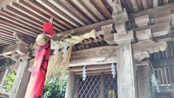 門扉の上には虹梁がわたされ、しめ縄がかけられています。