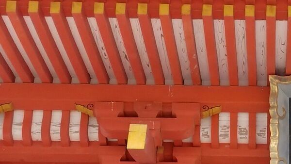 軒裏は二軒繁垂木。案内板によると、中世の建築でよく見られる六枝掛(三斗の上に垂木が6本かかる配置)の木割で設計されているとのこと。