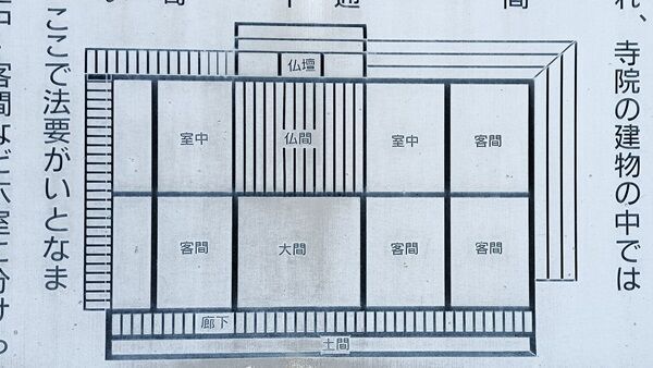 堂内は正面入り口から一間通りは土間、次の一間通りを板廊下とし、その奥を四間づつ二列・八室に仕切り、後列の中央西寄りに仏間を設け本尊を祀っている。仏間の前には大間があり、ここで法要がいとなまれる。仏間・大間の左右は、室中・客間など六室に分けられ、左端の桁行一間通りを、畳廊下とするほか、側・背の三面にはぬれ縁をめぐらした、構法の雄大な建築である。山梨県教育委員会