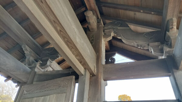 鐘楼門の柱は角柱で、繰型のついた木鼻や肘木が使われています。